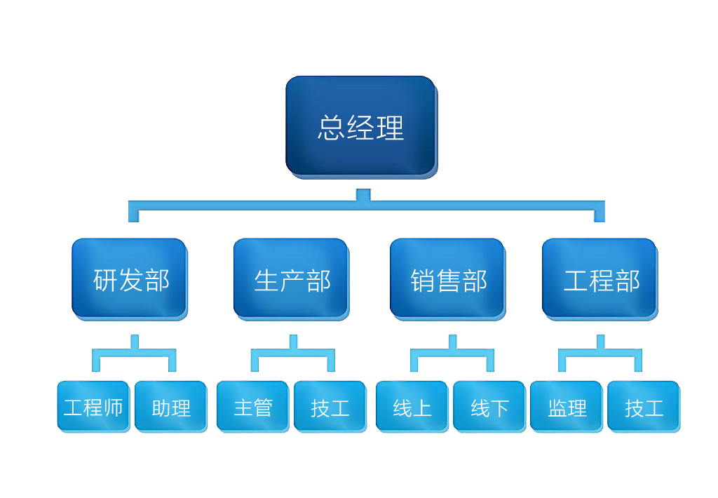 公司主要分為四大部門:研發(fā)部、生產(chǎn)部、銷售部和工程部。最高權(quán)利機(jī)構(gòu):總經(jīng)理主要負(fù)責(zé)公司的經(jīng)營決策、公司制度的審批以及人員聘用等方面的重大決策。以下是公司組織結(jié)構(gòu)圖。