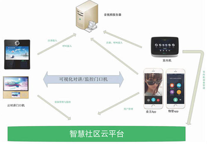 采用“云對講門口機(jī)+云平臺+音視頻平臺+室內(nèi)機(jī)+業(yè)主app+物管app”的系統(tǒng)架構(gòu)