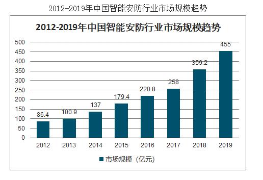 2018年我國安防行業(yè)總產(chǎn)值為7183億元,目前我國智能安防滲透率約為5%, 2018年我國智能安防市場(chǎng)規(guī)模為359.2億元。2012-2018年市場(chǎng)規(guī)模年復(fù)合增長(zhǎng)率高達(dá)26.8%,2019年我國智能安防市場(chǎng)規(guī)模約為455億元。