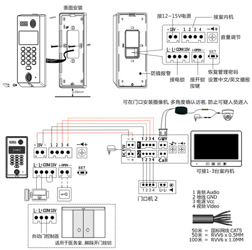 門口機(jī)功能: 可接室內(nèi)機(jī), 可實(shí)現(xiàn)呼叫、視頻傳輸、雙向?qū)χv、開鎖功能。