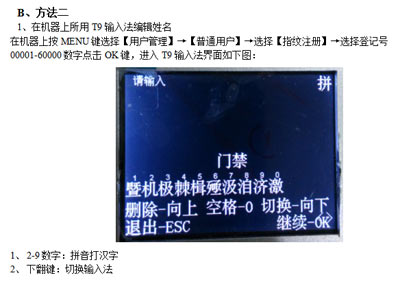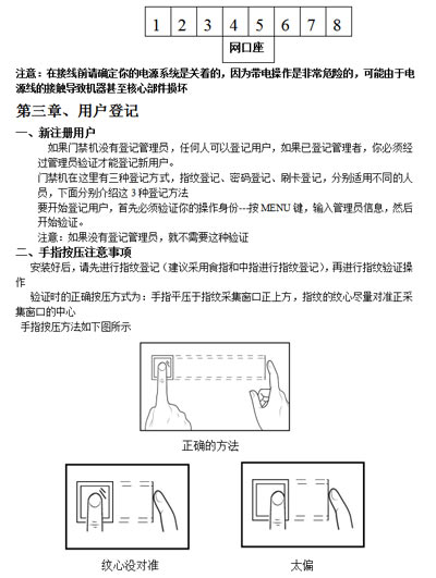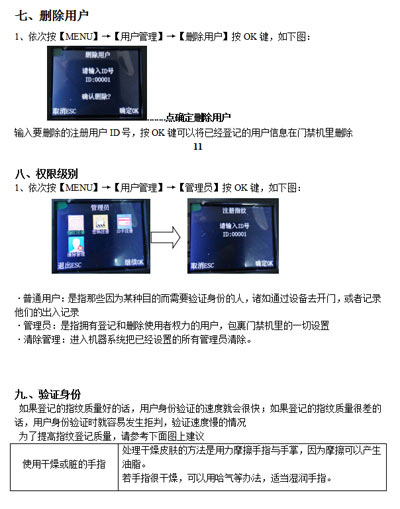 最終指紋還是無法識別的用戶,可將該指紋刷次再重新注冊,或注冊另一枚手指,這樣的用戶在注冊時(shí)需要選擇使用質(zhì)量較好的指紋(指紋清晰等),盡量使用手指接觸指紋采集頭面積大一些,注冊完成后做一下對比測試,并建議多注冊幾枚備用指紋。
